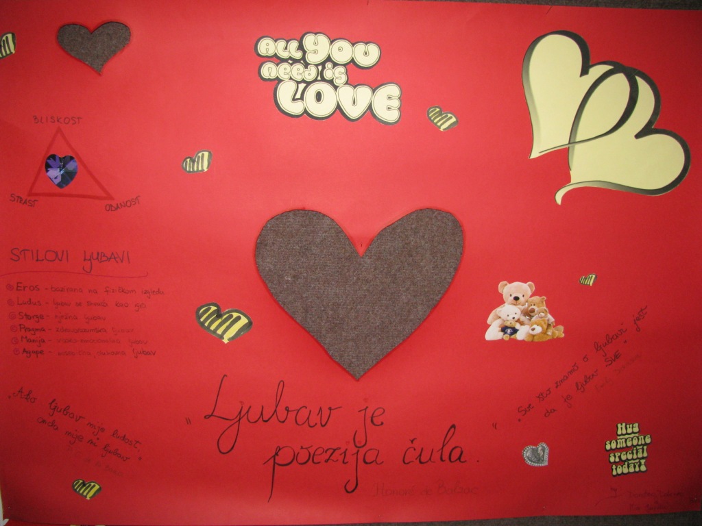 S obzirom na to da je veljača mjesec ljubavi i karnevala, organizirane su i prigodne radionice. Učenici su izradom plakata predstavili svoje viđenje ljubavi, a njezino viđenje senzibilnih pjesničkih duša približena im je instalacijom Ponesi ljubav . Iz postavljenih vrećica svatko je sa sobom mogao ponijeti ljubavni stih ili poruku ljubavi. Naravno, i duh karnevala začarao je našu školu, pa su maske, učenički radovi, izložene na školskom hodniku i u knjižnici, unosile dašak egzotike i zagonetnosti.